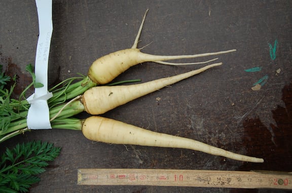 Sehr lange, glatte, walzenförmige, weiße Karotte ohne Grünkragen. Guter Geschmack.