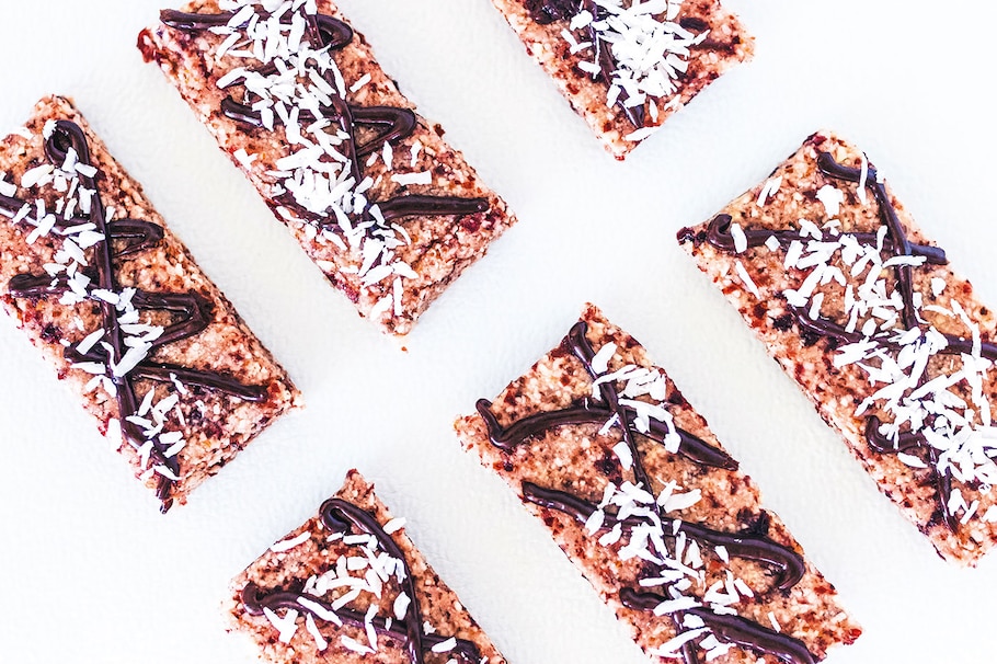 Die getrockneten, aber noch feuchten Riegel aus dem Trockner nehmen. Die Schokoladenglasur zubereiten, indem du alle Zutaten miteinander fein vermischst und mit einem dünnen Messer, einem Stäbchen oder einer kleinen Kanne mit feinem Ausguss die Streifen auf die Riegel zauberst. Am Schluss mit ein paar Kokosraspeln verzieren.