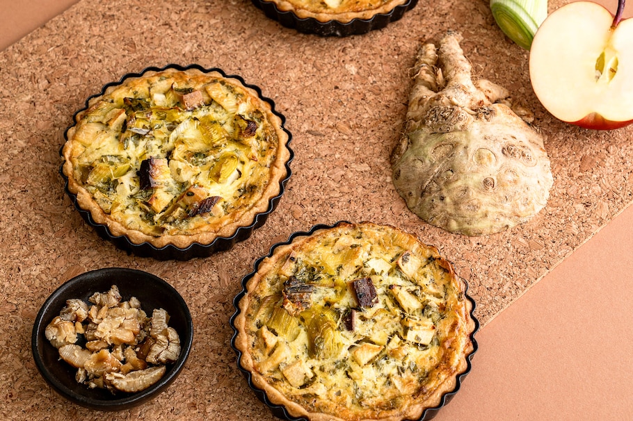 Pikante Tarte gefüllt mit Kastanien, Sellerie und Tofu